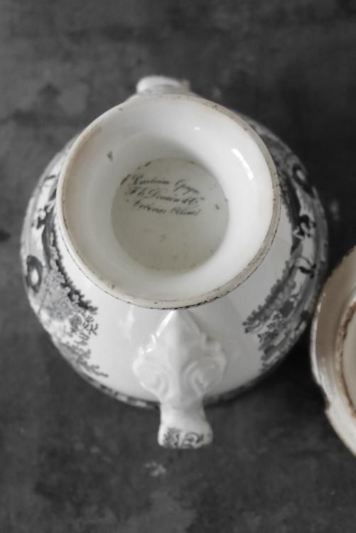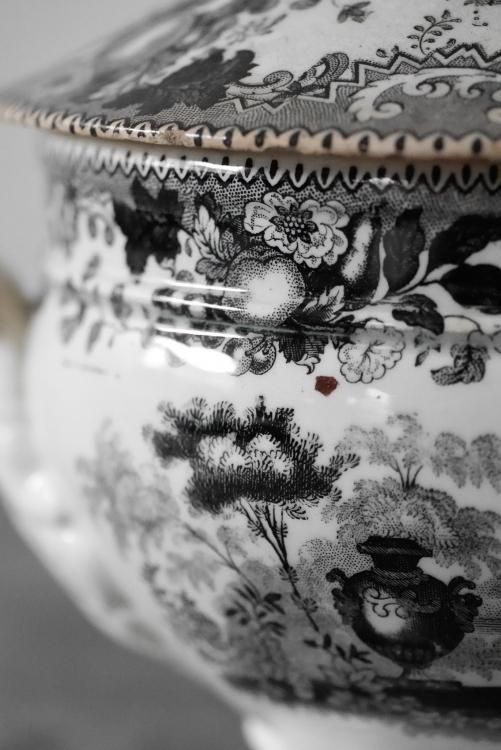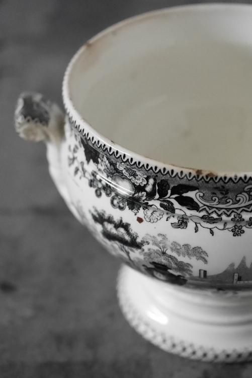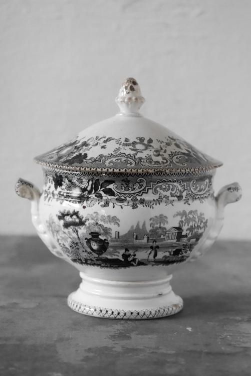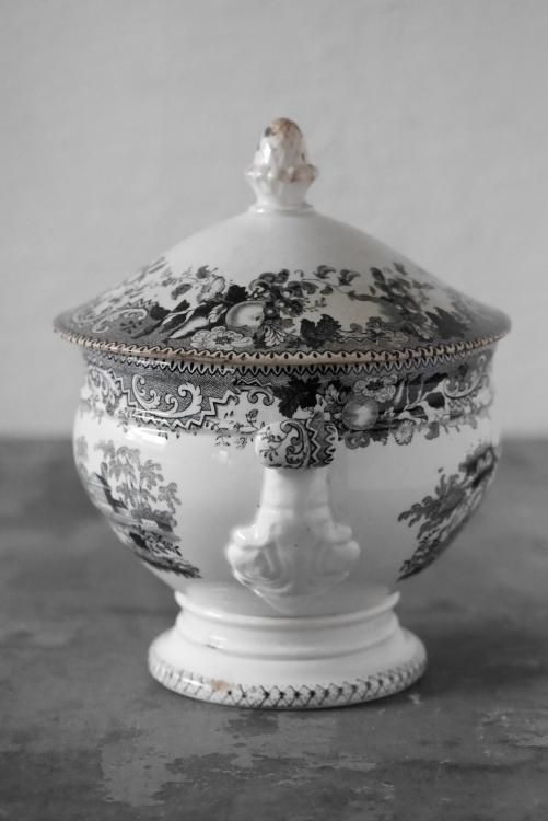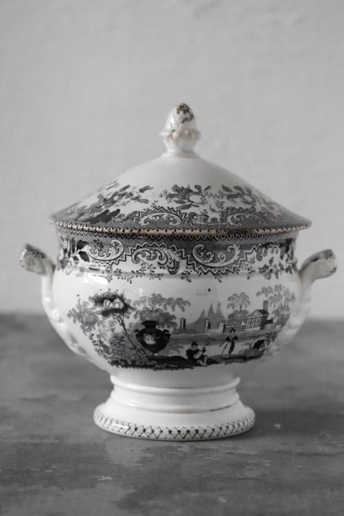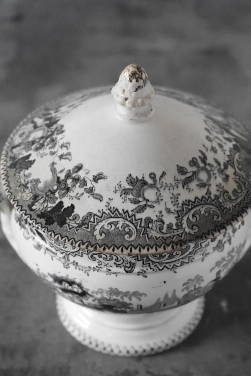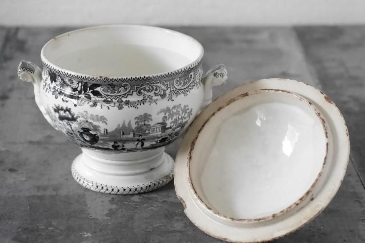 陶器製、フタ付きのブイヨンポットです。 グリザイユの絵付けとハンドルの装飾が美しい
