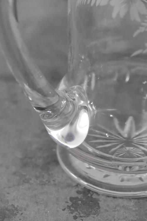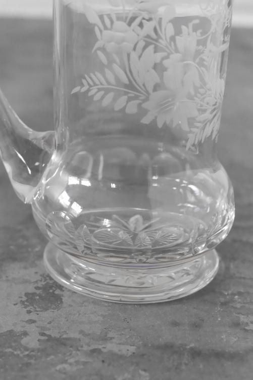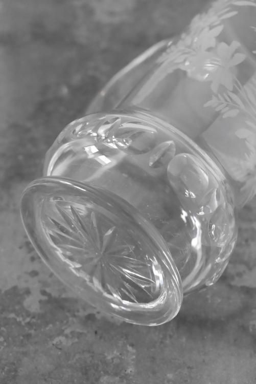 底や側面のカットやボタニカルモチーフの装飾、カリグラフィにガラスの滑らかな質感など