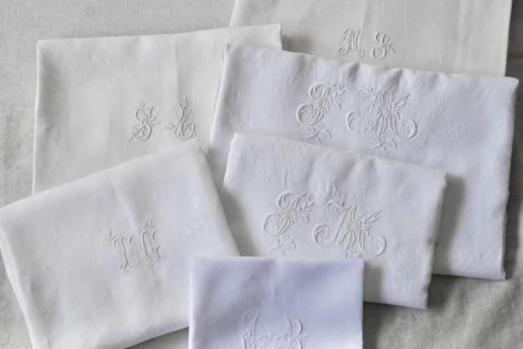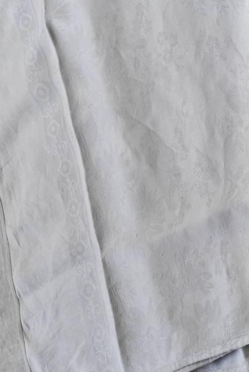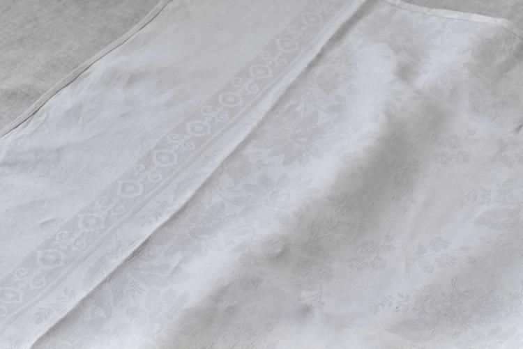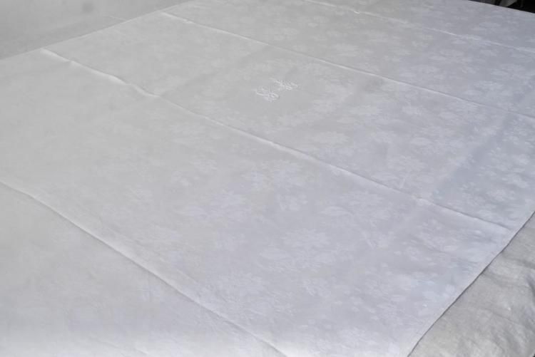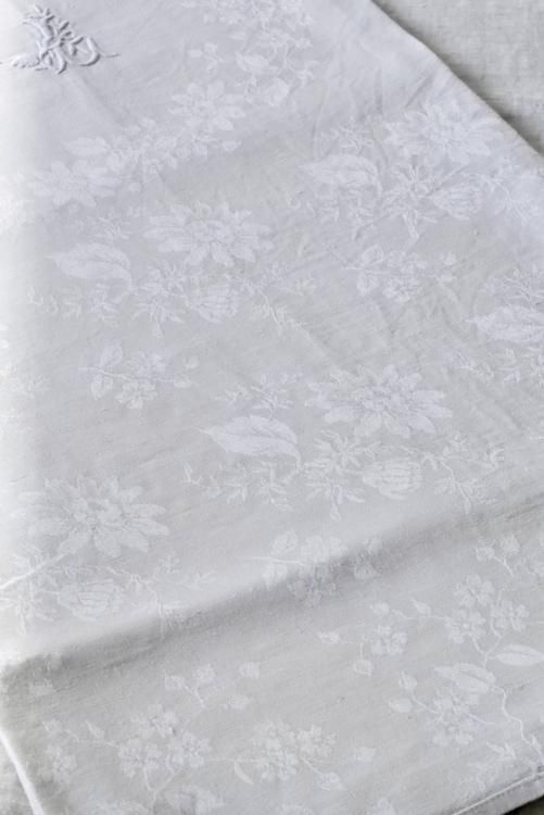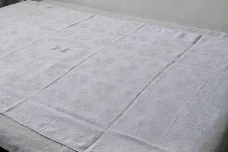 ダマスク織りのテーブルクロス、布中央にSLのイニシャル刺繍が施されています。