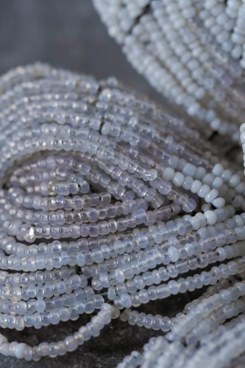 半透明のミルクガラスや、半透明のブルーグレー、ごく薄いパープル味のあるクリアビーズが使用されています。