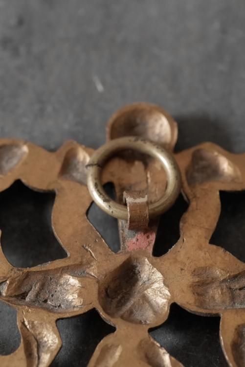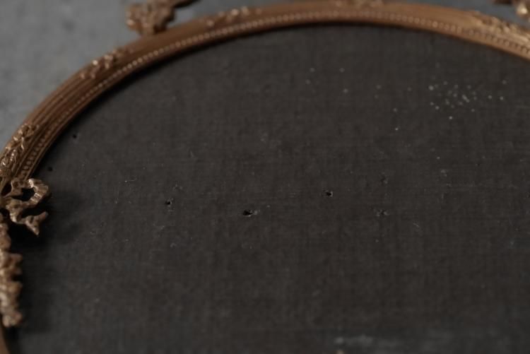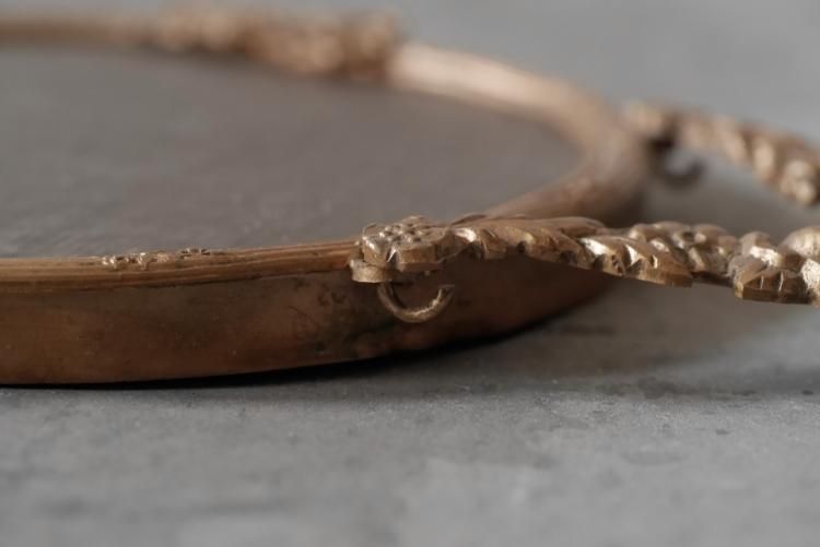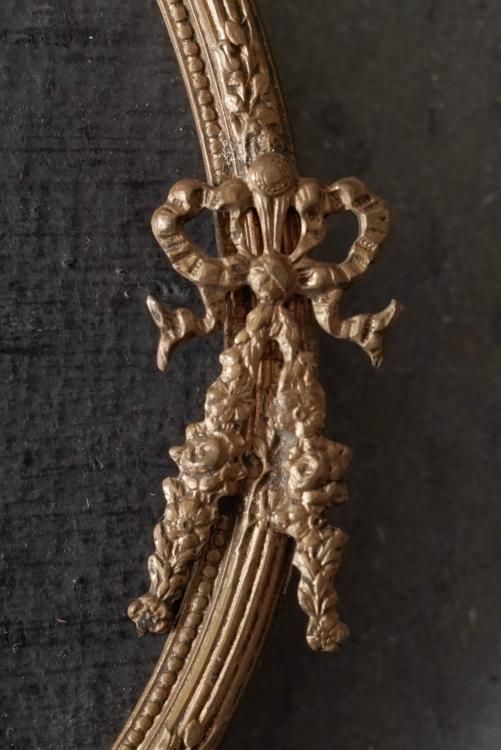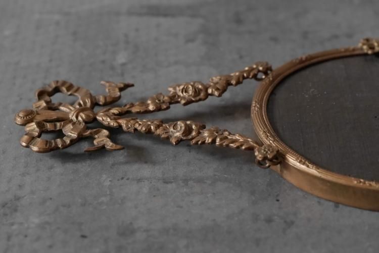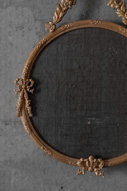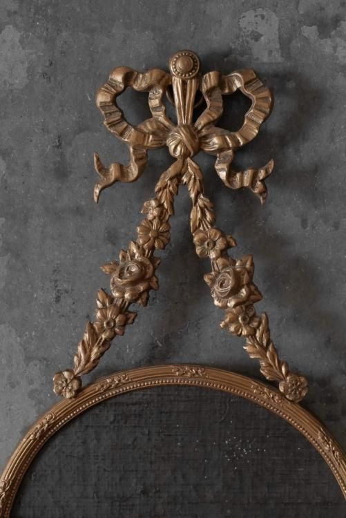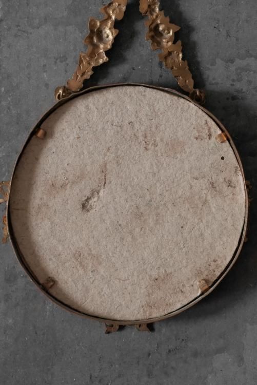壁面吊り下げタイプのラウンドフレーム、繊細なリボンモチーフと、ガーランドの吊り金具が大変素敵なお品物です。