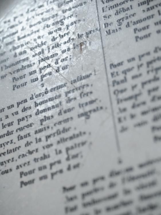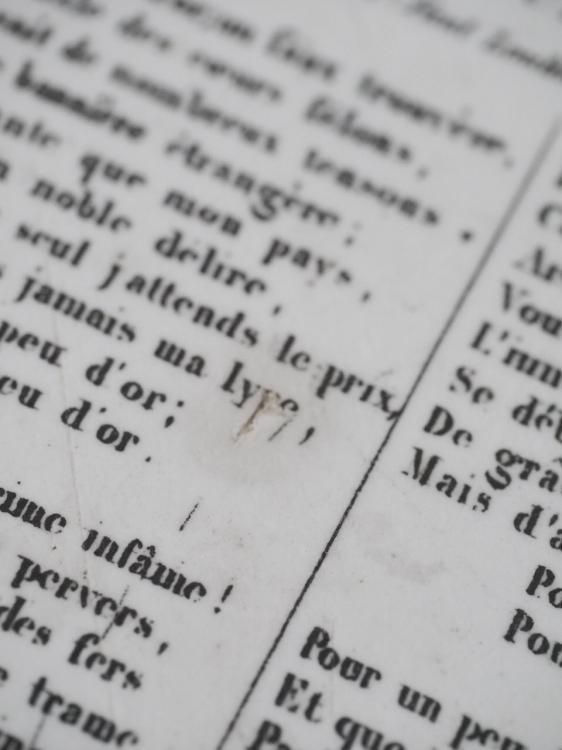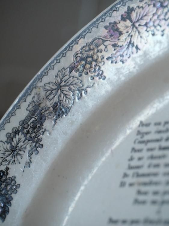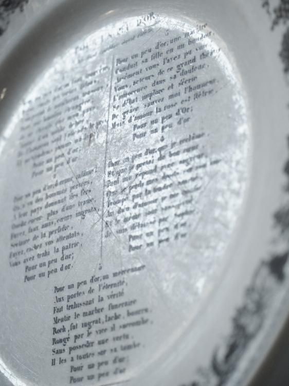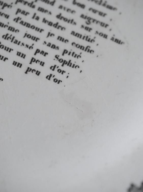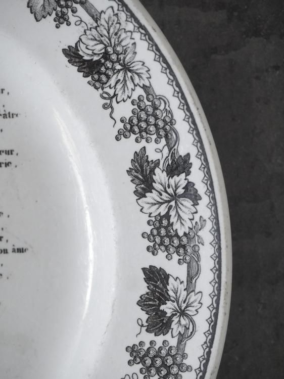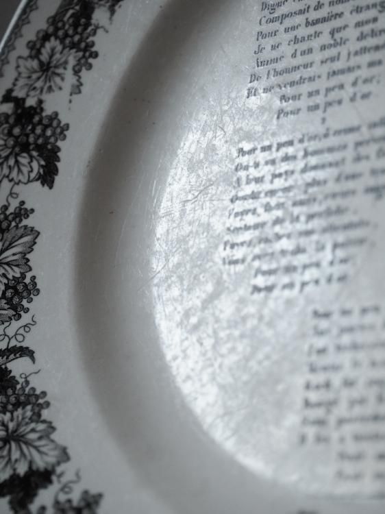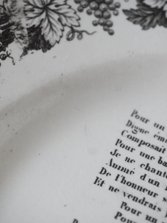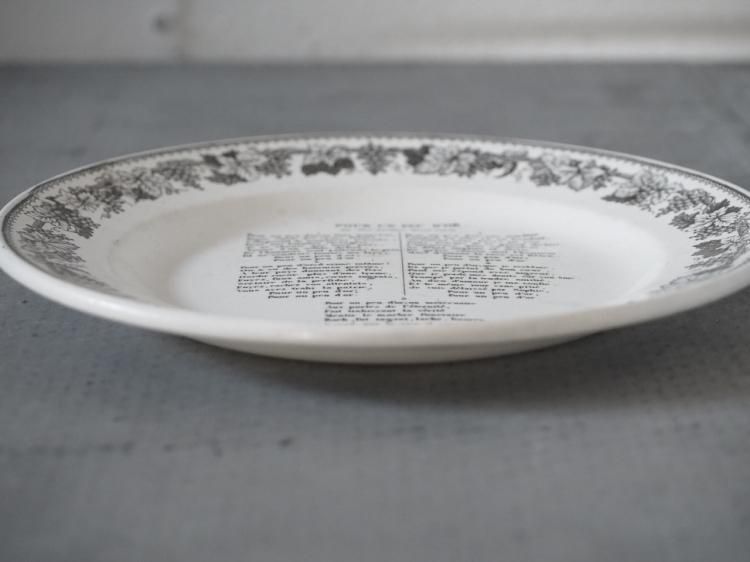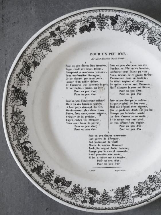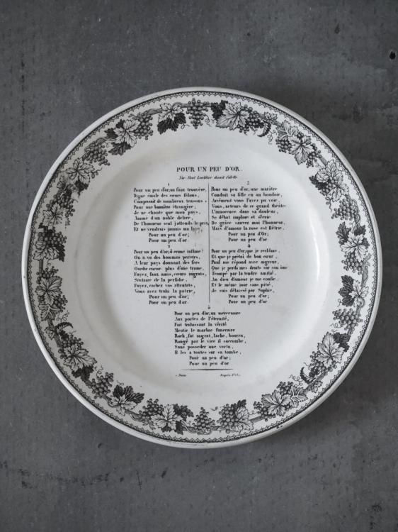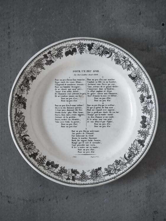 シャンソンの歌詞が書かれたグリザイユプレート、1840年前後に作られたお品物と推測されます。