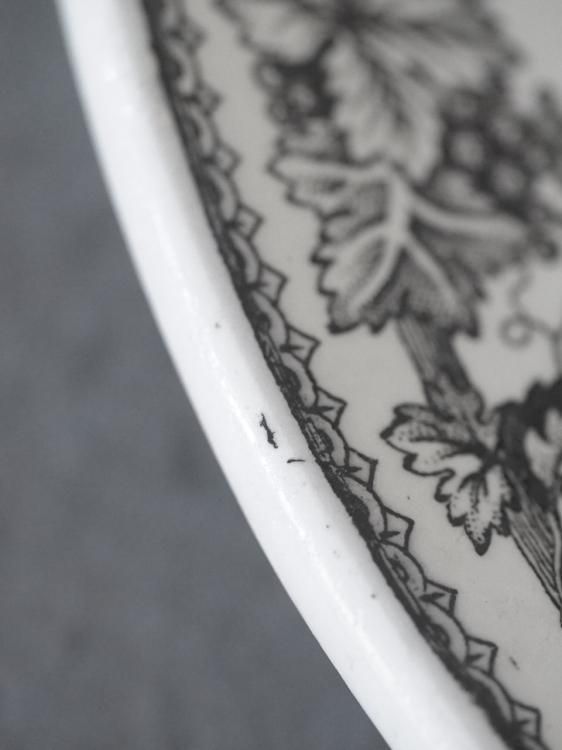リム部分は葡萄の蔓や葉、実のガーランド装飾が描かれ、シックな雰囲気です。