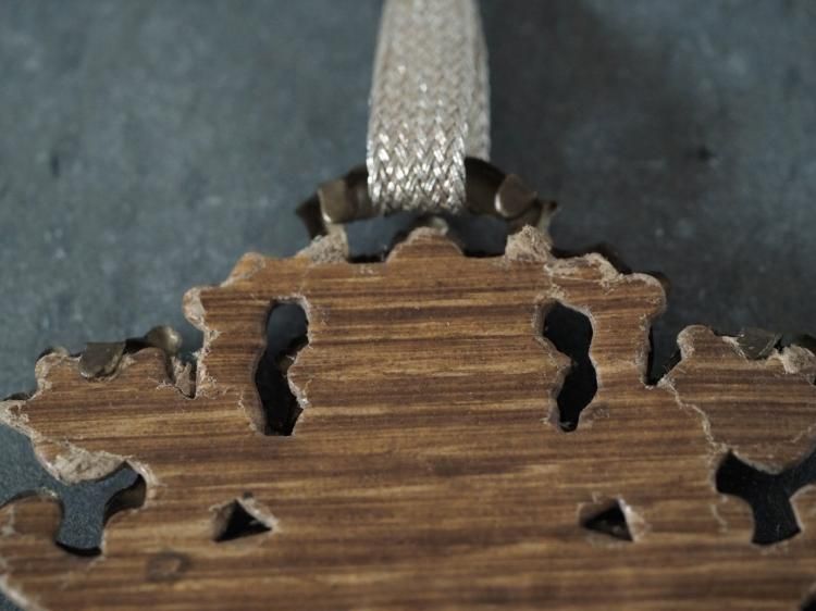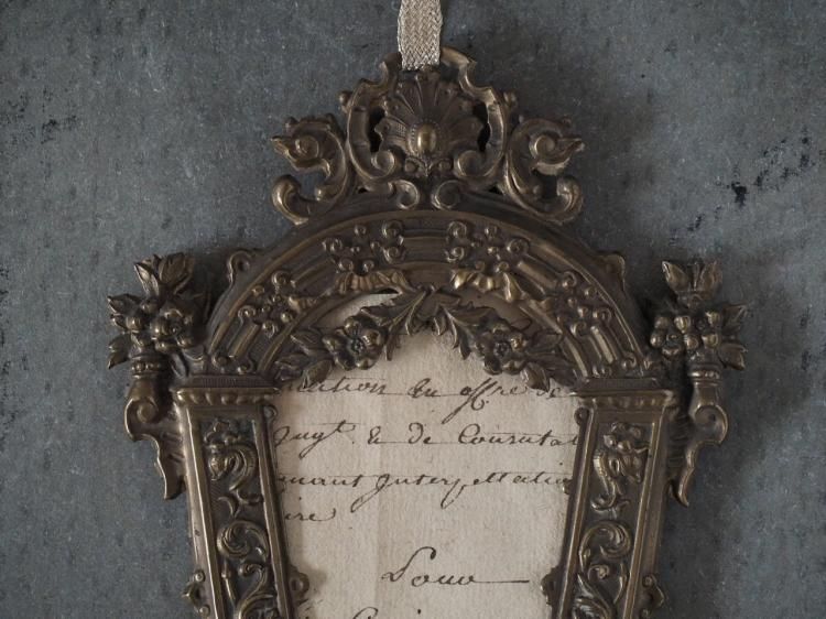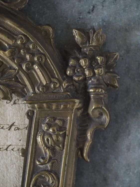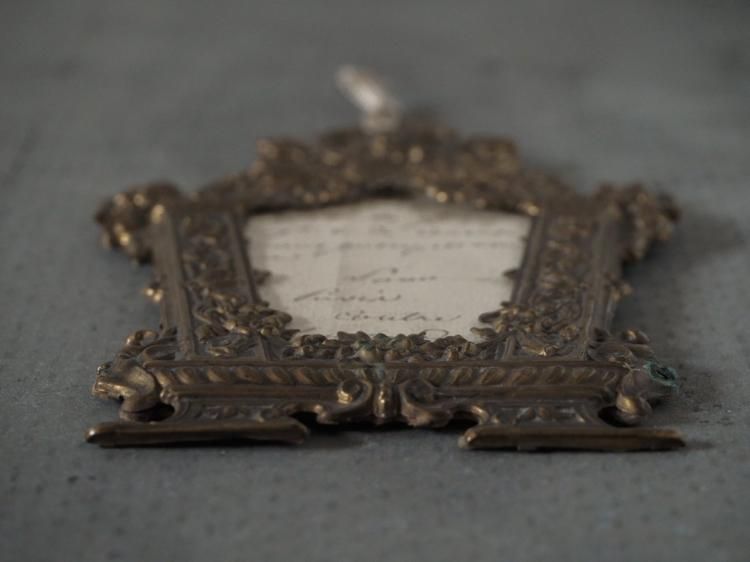 小さめながら、大変凝った装飾で、鈍く黒ずんだゴールド色がシックな雰囲気となっています。
