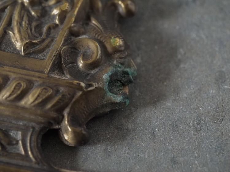 フレーム下部、右側のヴィサージュに、やや目立つ緑青と錆欠けがございますが、