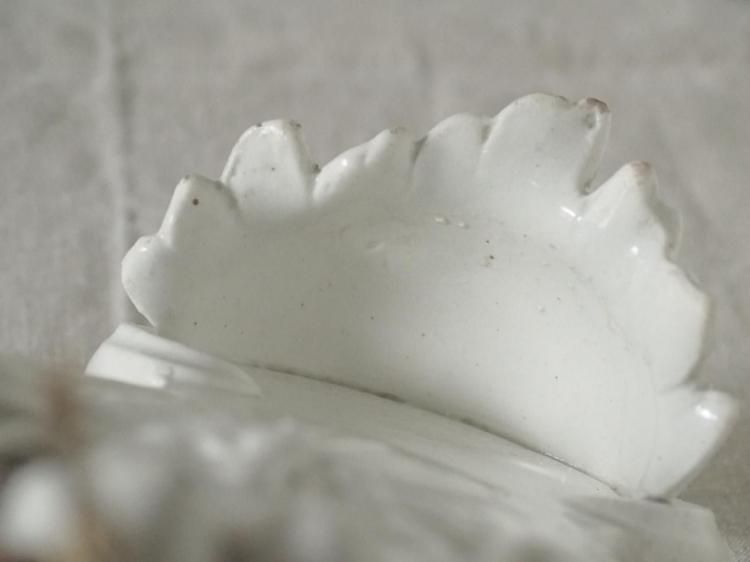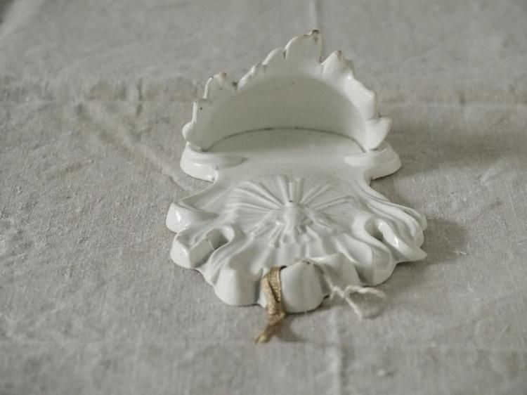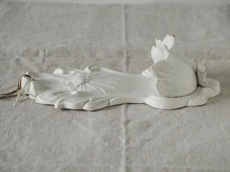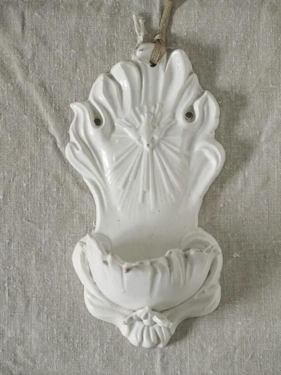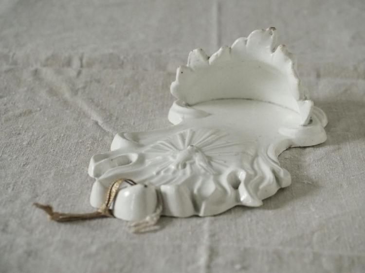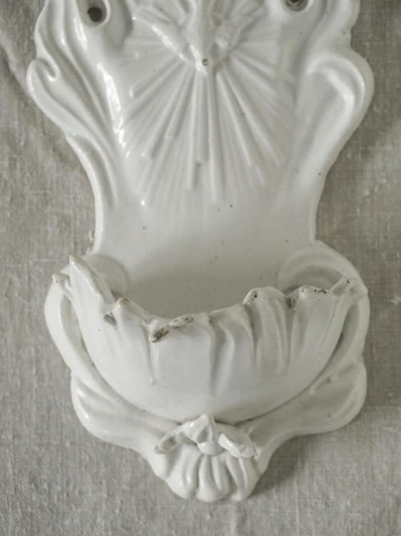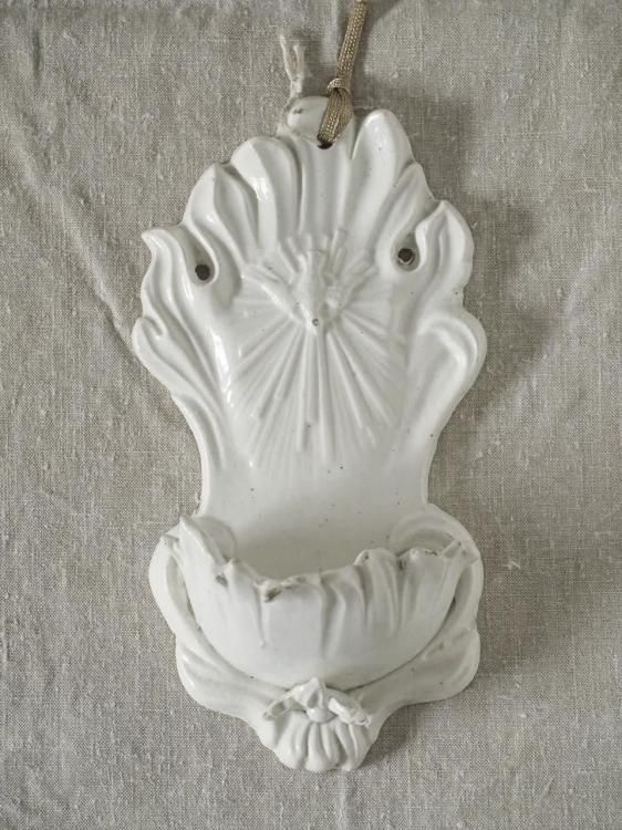 微かに青白い釉薬と美しいフォルム、コロンブのモチーフが素敵なベニティエ、聖水盤です。