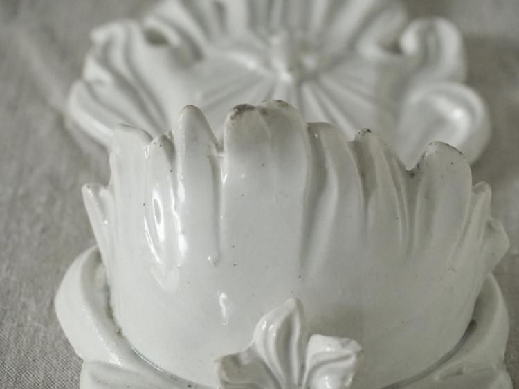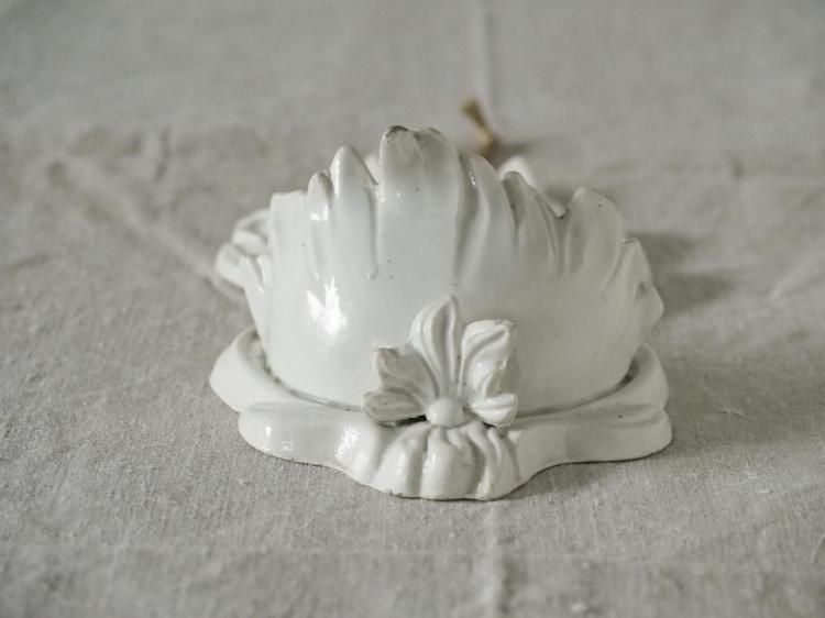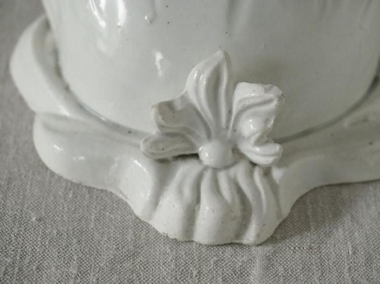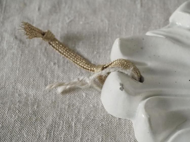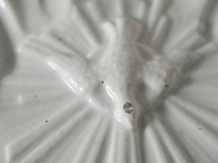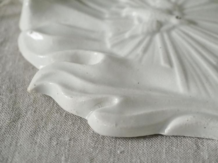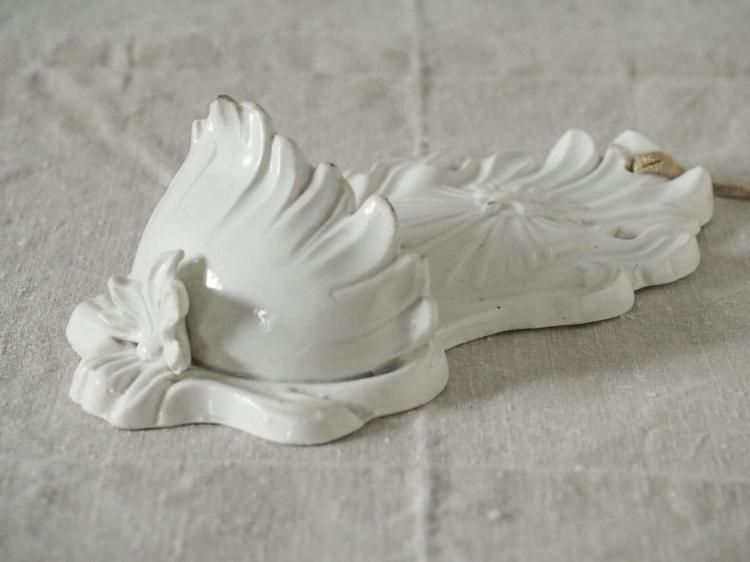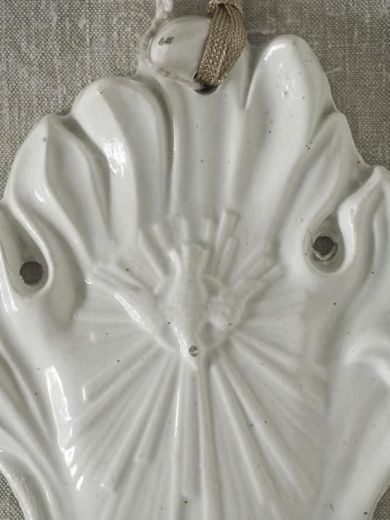微かに青白い釉薬と美しいフォルム、コロンブのモチーフが素敵なベニティエ、聖水盤です。